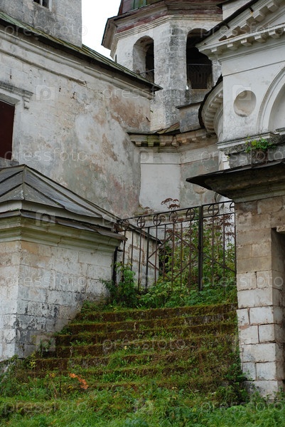 Лестница старинной церкви, заросшая травой