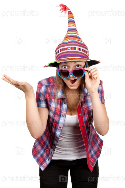 Забавная девушка в цветной шляпе и солнечных очках на белом фоне