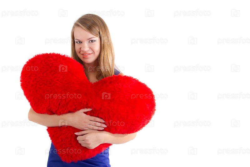 Молодая красивая девушка обнимает большое мягкое сердце