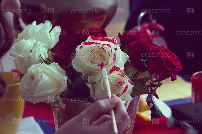Женщина красит белые розы красной краской
