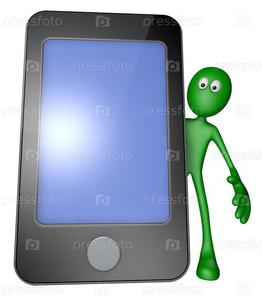 Зеленый парень за смартфоном - 3D иллюстрация