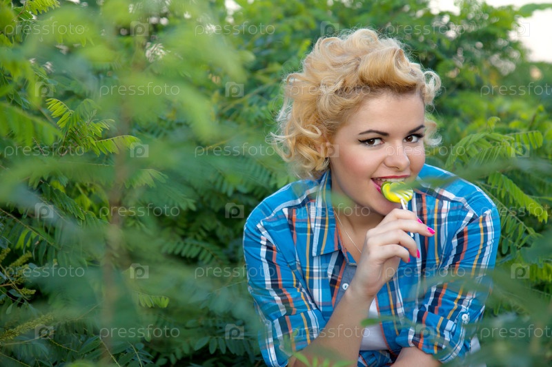 Девушка пин ап с леденцом на фоне природы