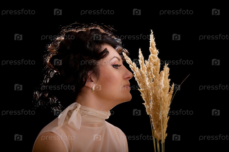 Темноволосая модная женщина держит колосья на черном фоне