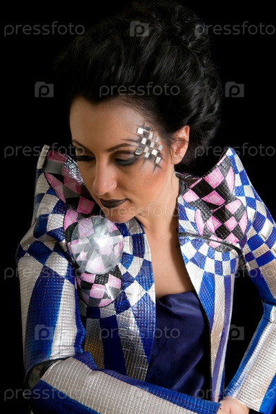 Женщина с макияжем с кристаллами и в творческом костюме