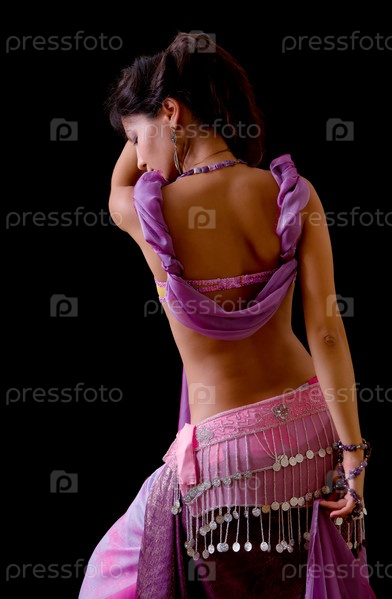 Испольнительница танца живота в карнавальном наряде на черном фоне