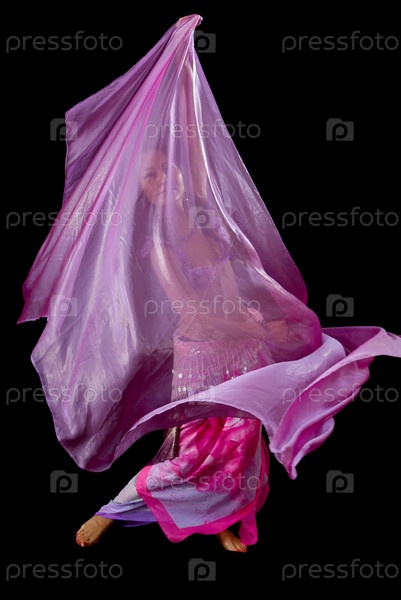 Испольнительница танца живота в карнавальном наряде на черном фоне