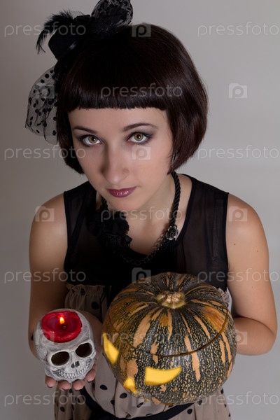 Милая девушка - ведьма с черепом и тыквой