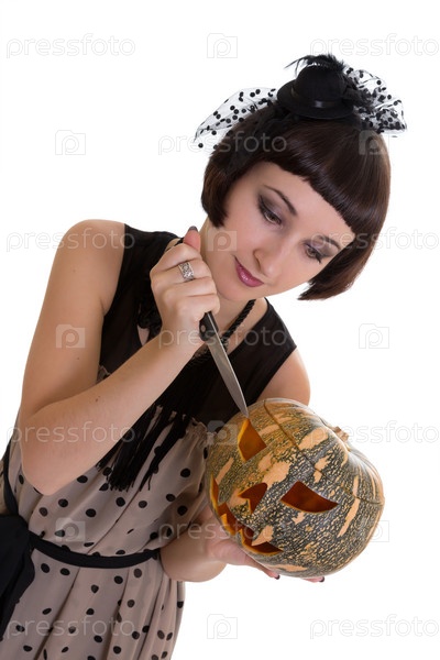 Красивая женщина режет тыку ножом, изолировано