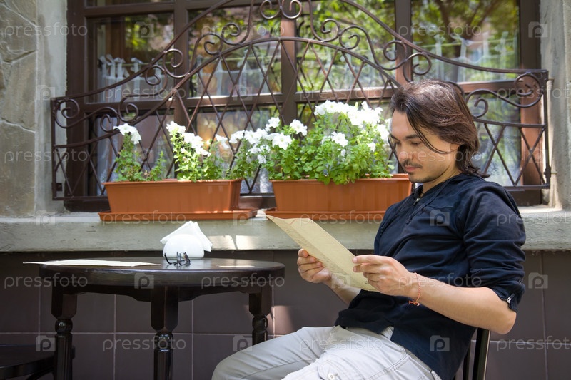 Сипматичный молодой человек сидит в кафе на террасе
