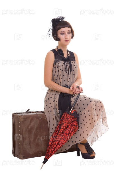 Красивая брюнетка с зонтиком и старым чемоданом