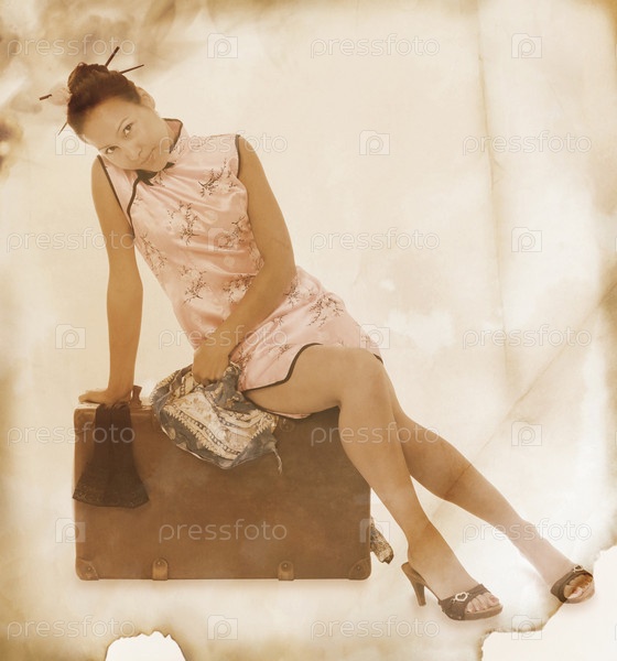 Азиатская женщина в китайском платье со старым чемоданом