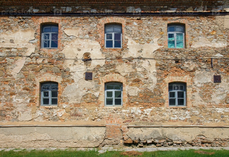 Старая оранжевая кирпичная стена с шестью окнами