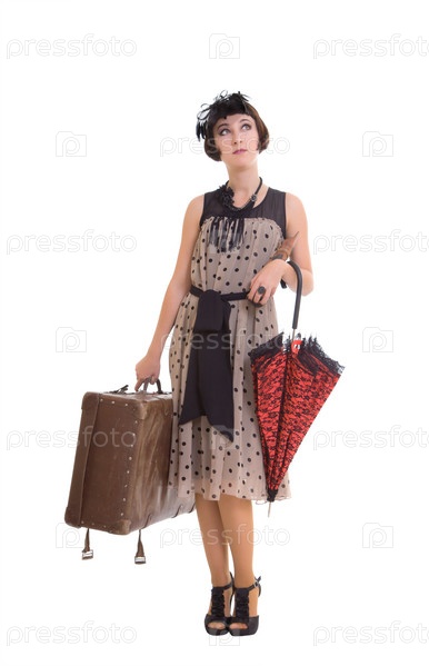 Красивая брюнетка с зонтиком и старым чемоданом