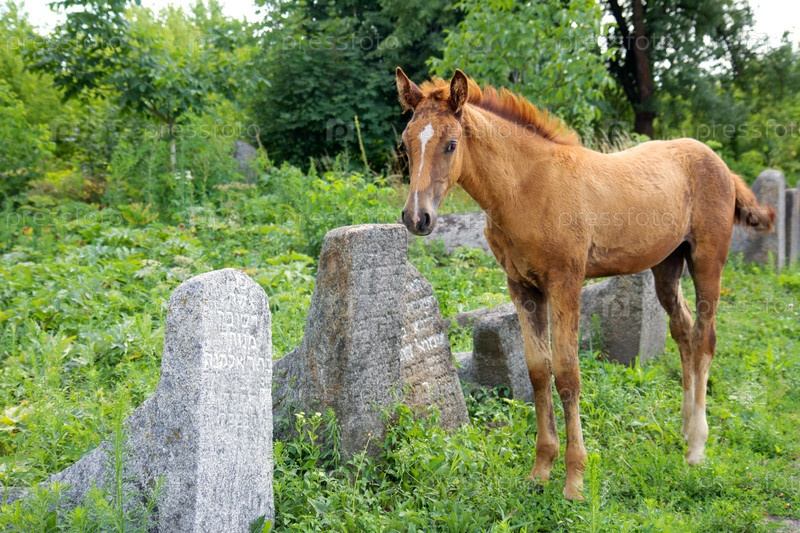 Лошадь на старом еврейском кладбище в Бердичеве, Украина