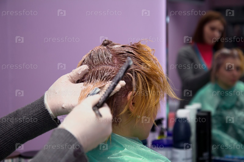 Парикмахер наносит краску на женские волосы в салоне