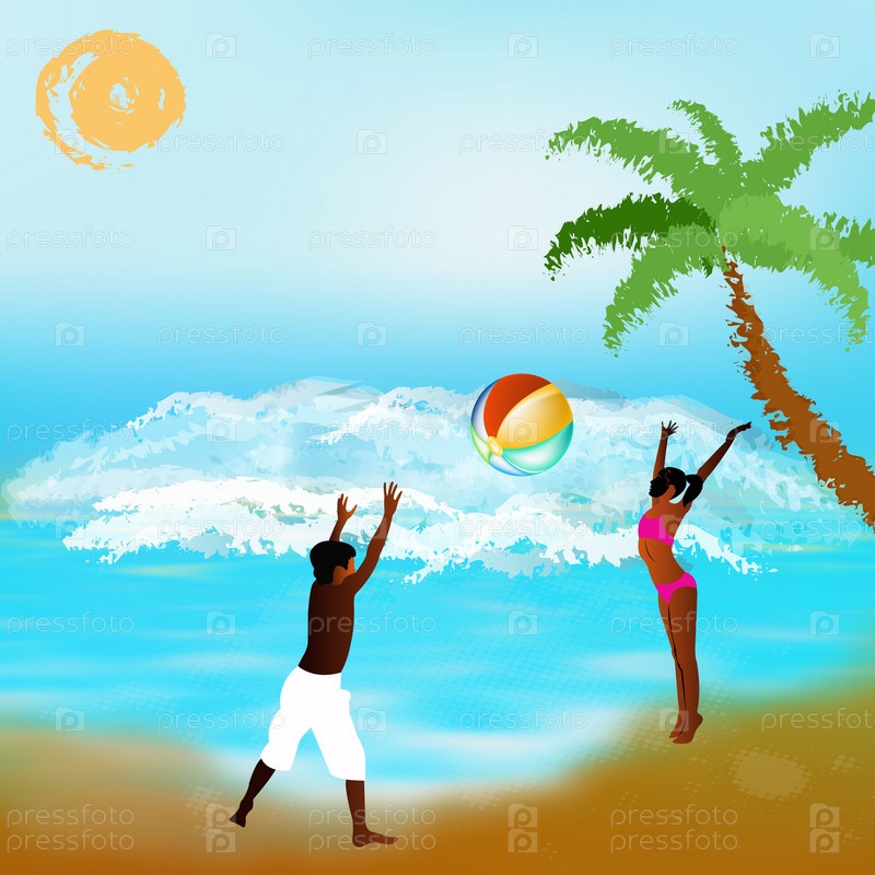 Дети играют в мяч на экзотическом морском пляже. Счастливый летний детский отдых