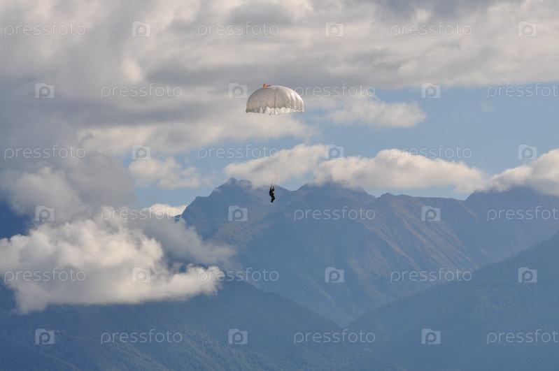 Белый парашют в небе над горными вершинами