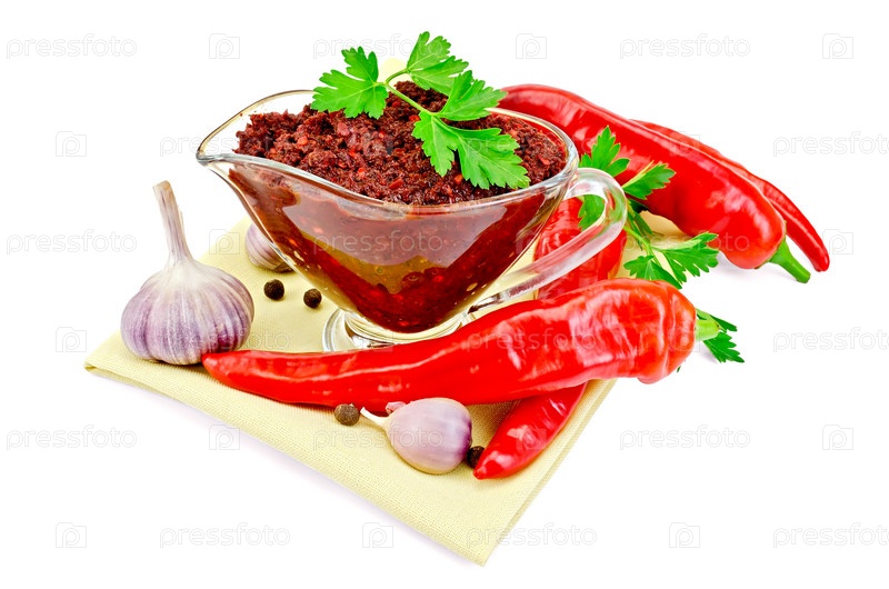 Аджика в стеклянном соуснике на салфетке