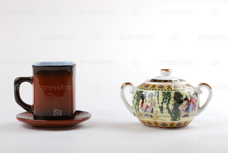 Кружка и сахарница на белом фоне