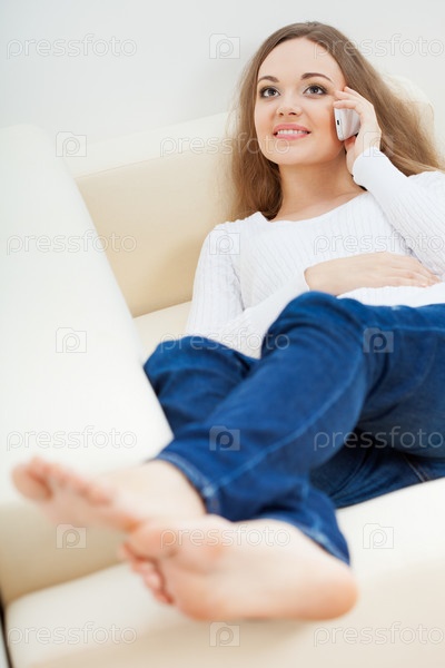 Женщина лежит на диване и говорит по телефону