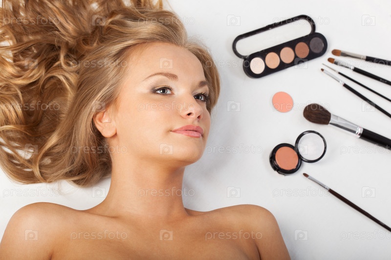 Женщина лежит на полу с тенями для век и кисточками