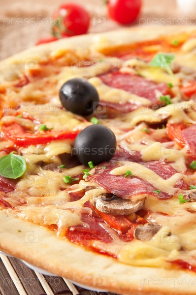 Пицца с салями, помидорами, грибами