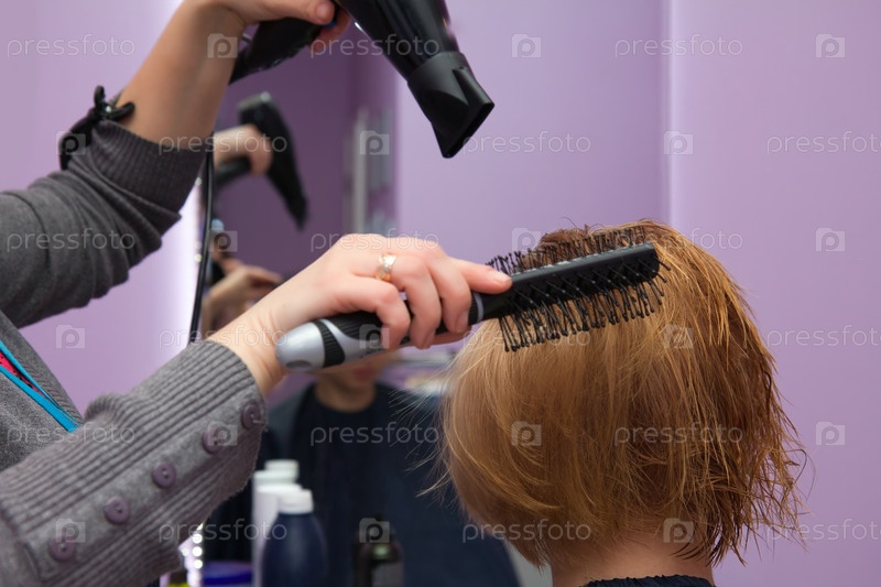 Парикмахер сушит волосы женщины в салоне