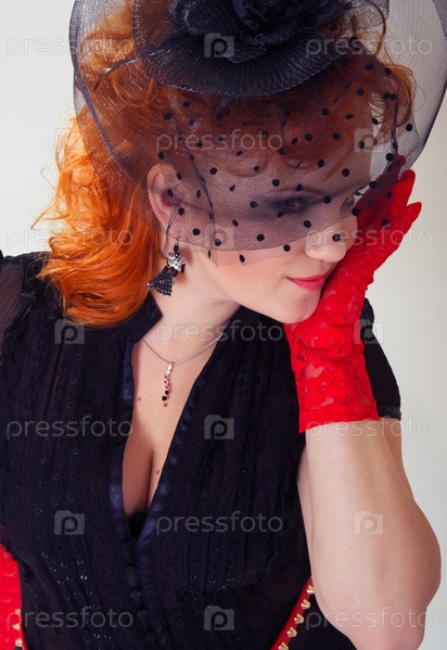 Молодая женщина с рыжими волосами в черной шляпе с вуалью