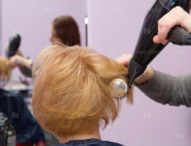 Парикмахер сушит волос женщины в салоне