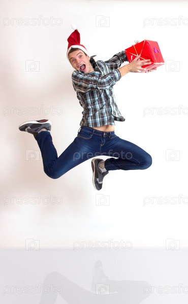 Молодой прыгающий мужчина в шапке Санты с подарками