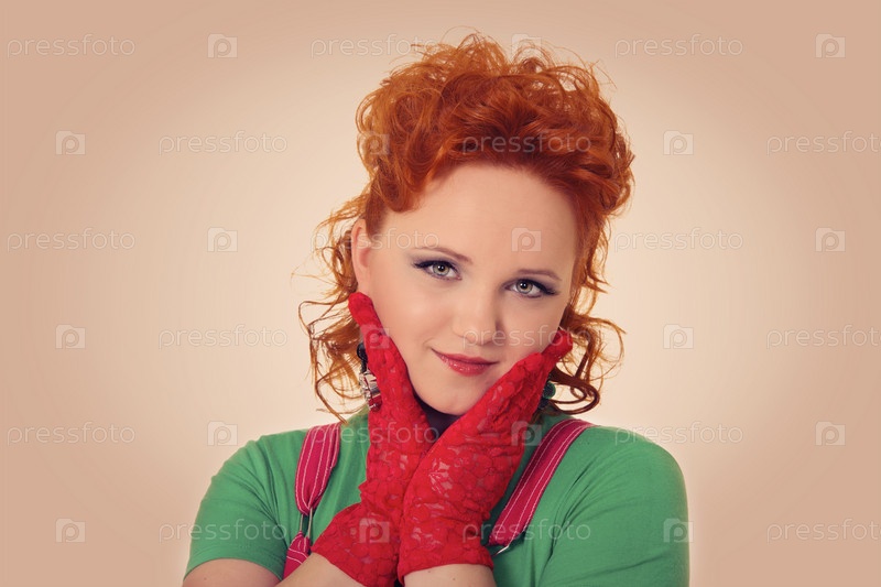 Красивая женщина с рыжими волосами и красными перчатками
