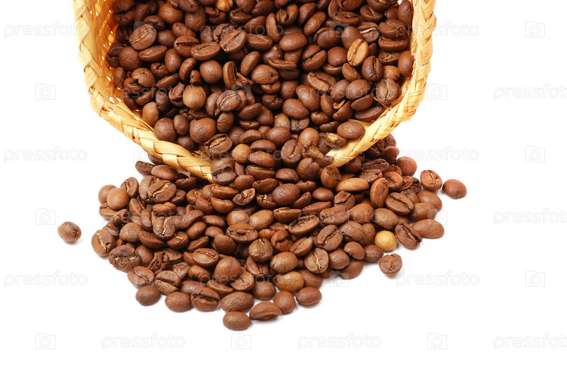 Кофейные зерна в корзинке на белом фоне
