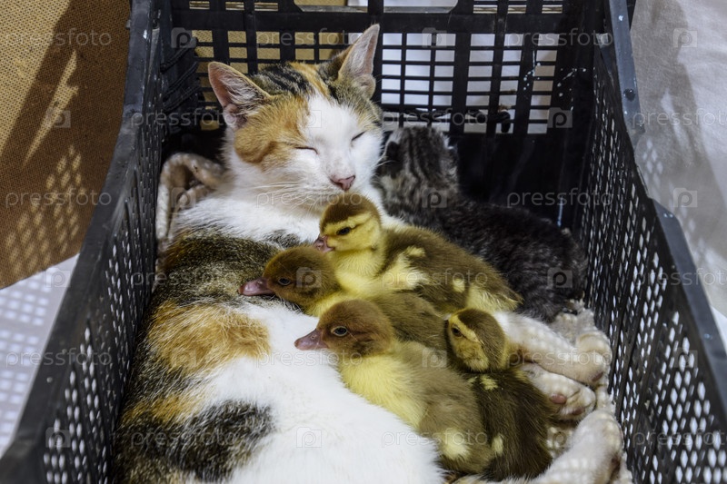 Кошка в корзине с утятами и котятами