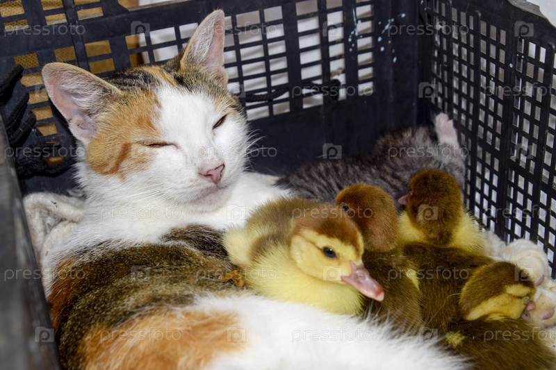 Кошка в корзине с утятами и котятами