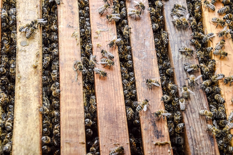 Открытый пчелиный улей. Планки с сотами в улье