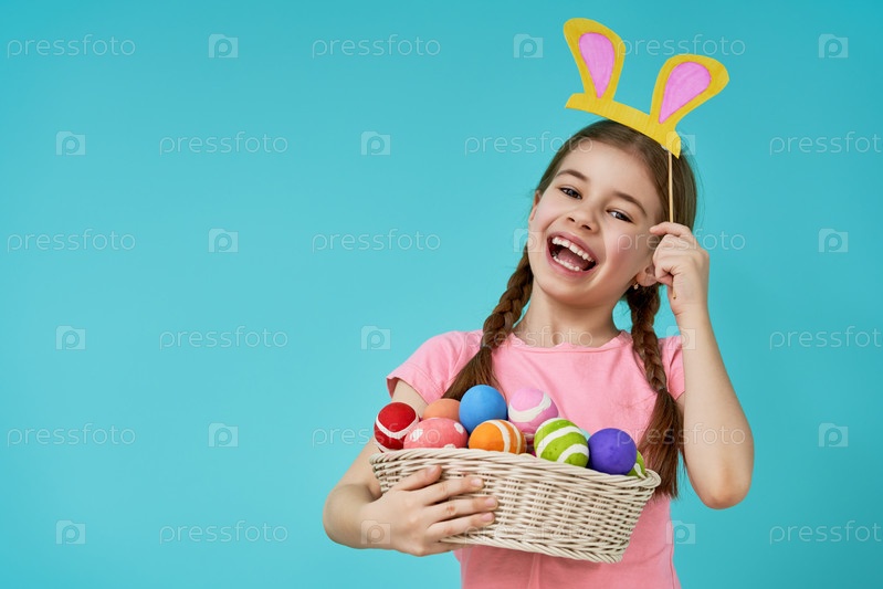 Девочка держит корзину с крашеными яйцами
