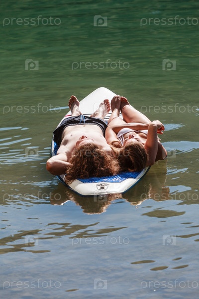 Пара спит на доске для серфинга в озере