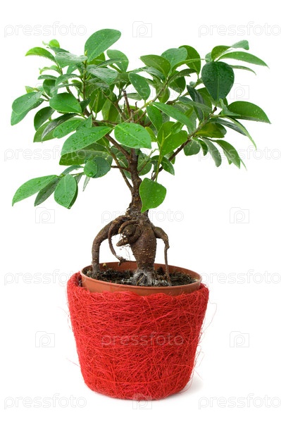 Фикус в красно-коричневом горшке, изолированный на белом
