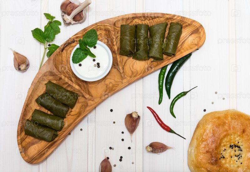 Долма на деревянной тарелке с острым перцем, чесноком, мятой и сметаной