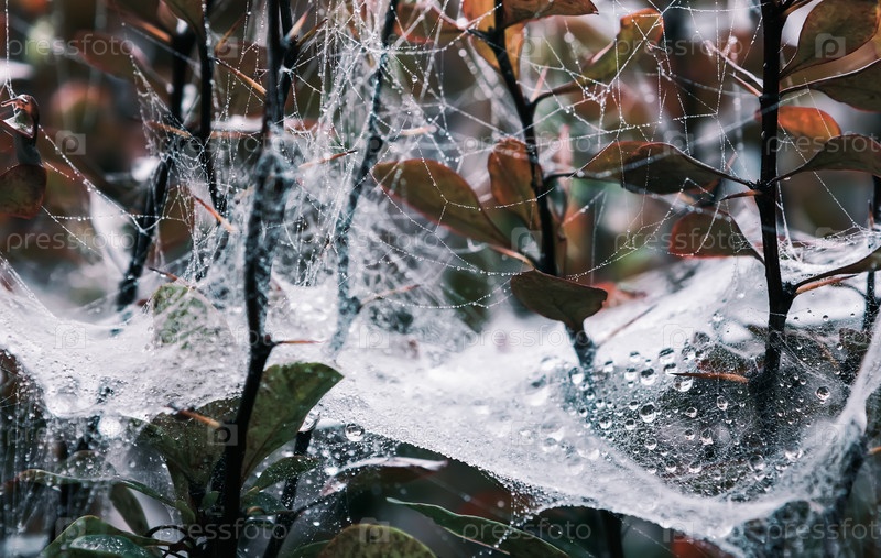 Паутина с каплями росы на ветках