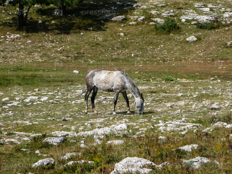 Серая лошадь пасется в горах
