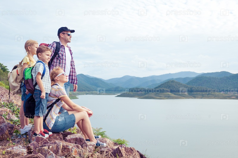 Счастливая семья, стоя рядом с озером