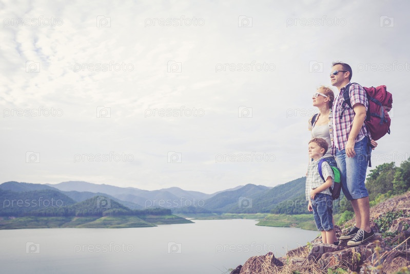 Счастливая семья, стоя рядом с озером