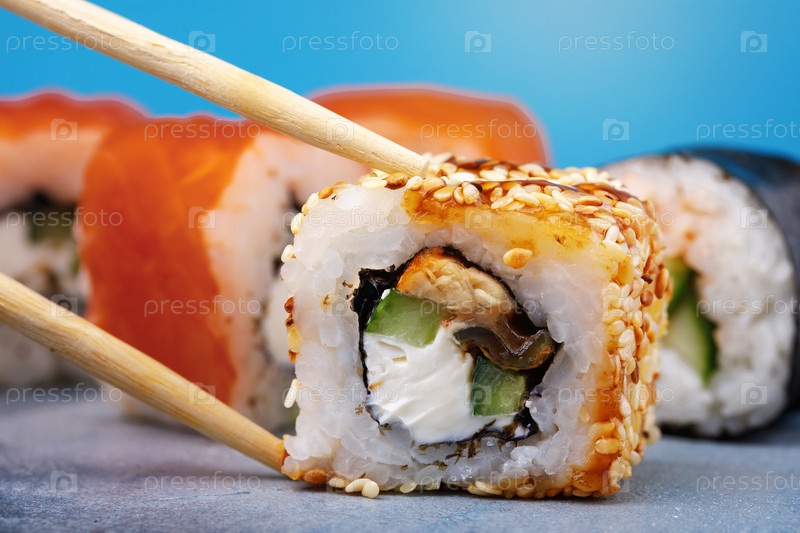 Руллы унаги маки с огурцом, угрем, кунжутом и красной рыбой