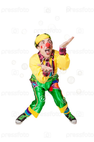 Веселый клоун в мыльных пузырях, изолированный на белом фоне