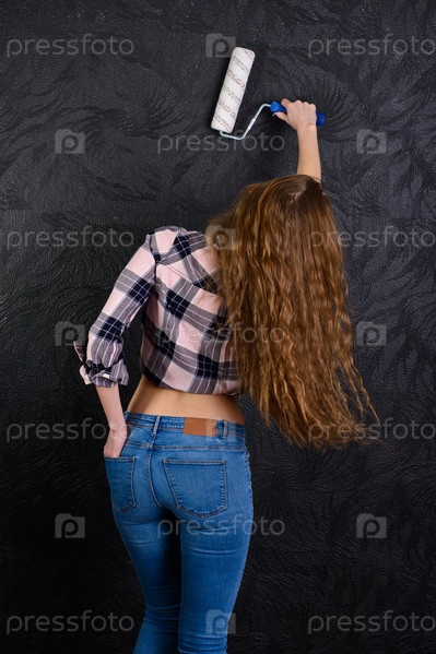 Девушка в валиком для покраски стен