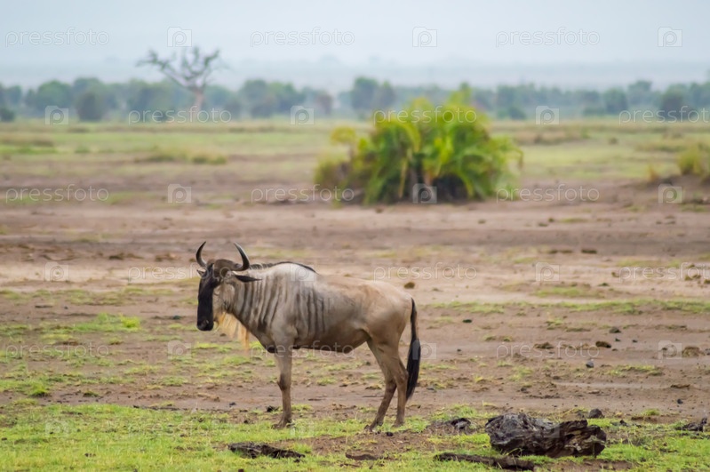 Гну пасутся в саванне Амбосели парка в Кении