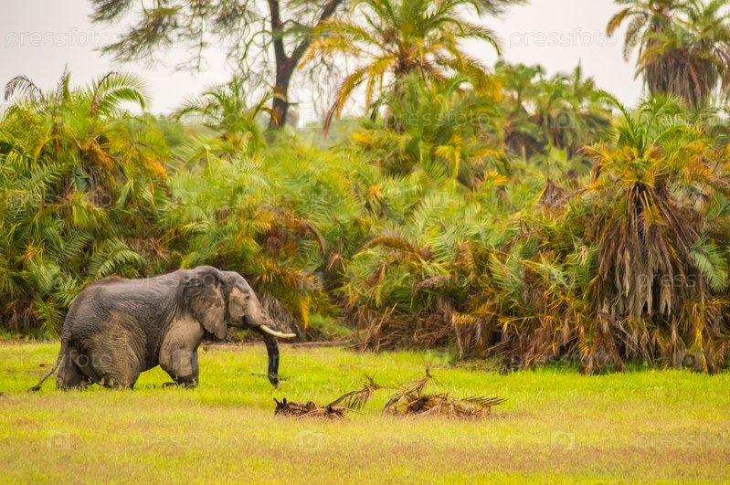 Одинокий слон в пальмовом оазисе в Амбосели парке в Кении
