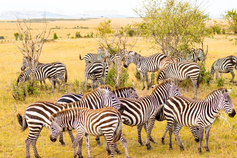Стадо зебр в саванне Масаи Мара парка на северо-западе Кении