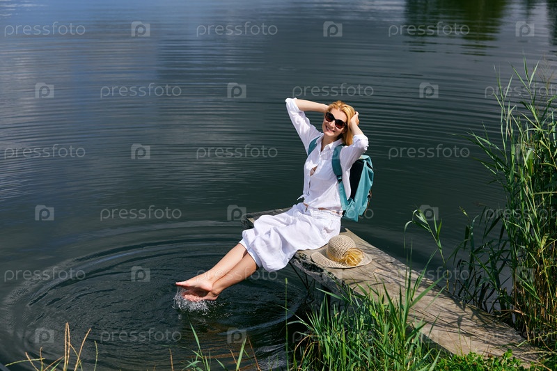 Молодая женщина отдыхает рядом с озером